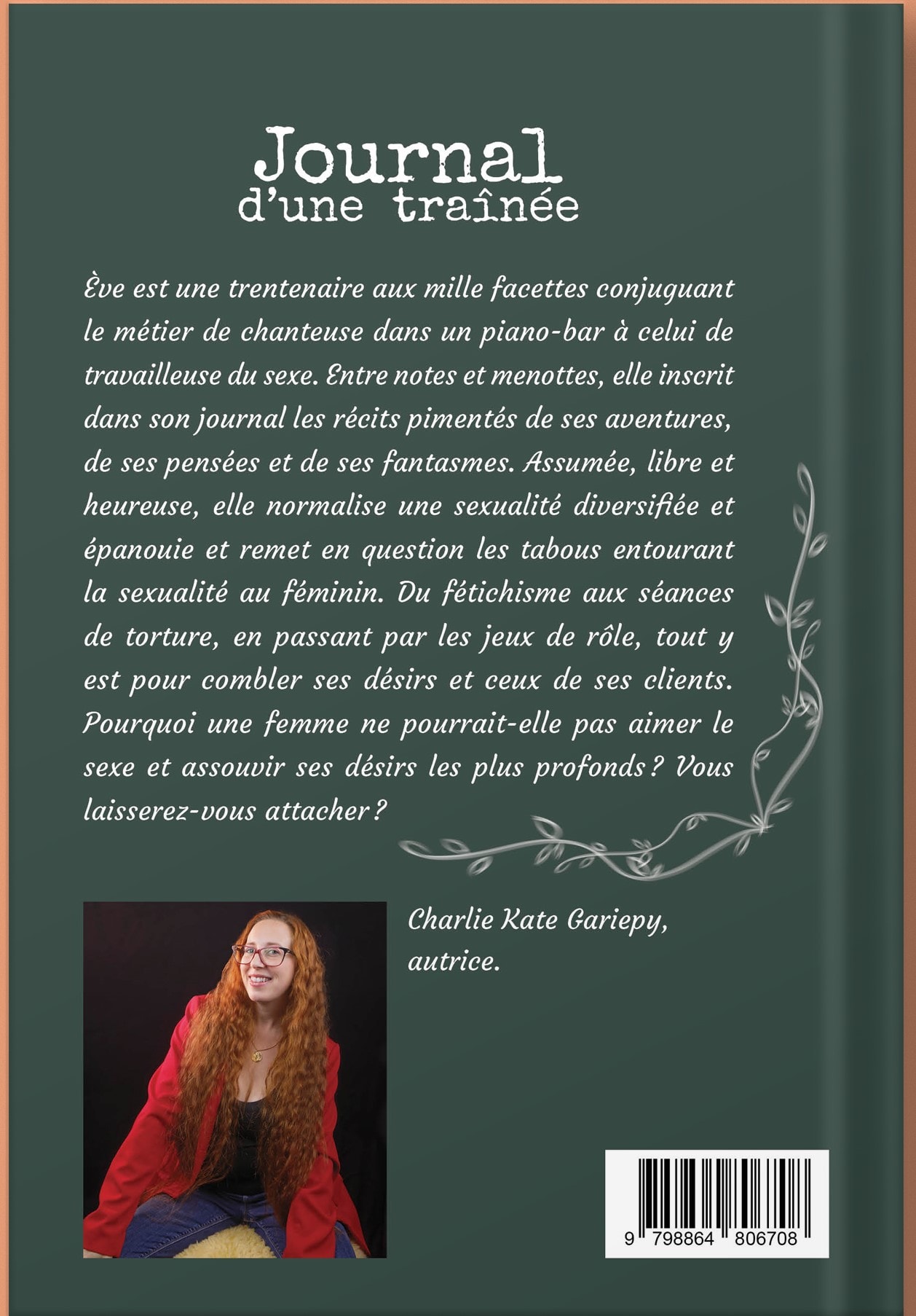 Ève est une trentenaire aux mille facettes conjuguant le métier de chanteuse dans un piano-bar à celui de travailleuse du sexe. Entre notes et menottes, elle inscrit dans son journal les récits pimentés de ses aventures, de ses pensées et de ses fantasmes. Assumée, libre et heureuse, elle normalise une sexualité diversifiée et épanouie et remet en question les tabous entourant la sexualité au féminin. Du fétichisme aux séances de torture, en passant par les jeux de rôle, tout y est pour combler ses désirs et ceux de ses clients. Pourquoi une femme ne pourrait-elle pas aimer le sexe et assouvir ses désirs les plus profonds? Vous laisserez-vous attacher? Charlie Kate Gariépy Autrice